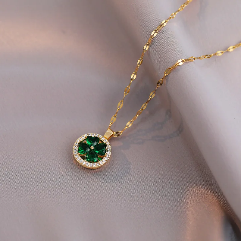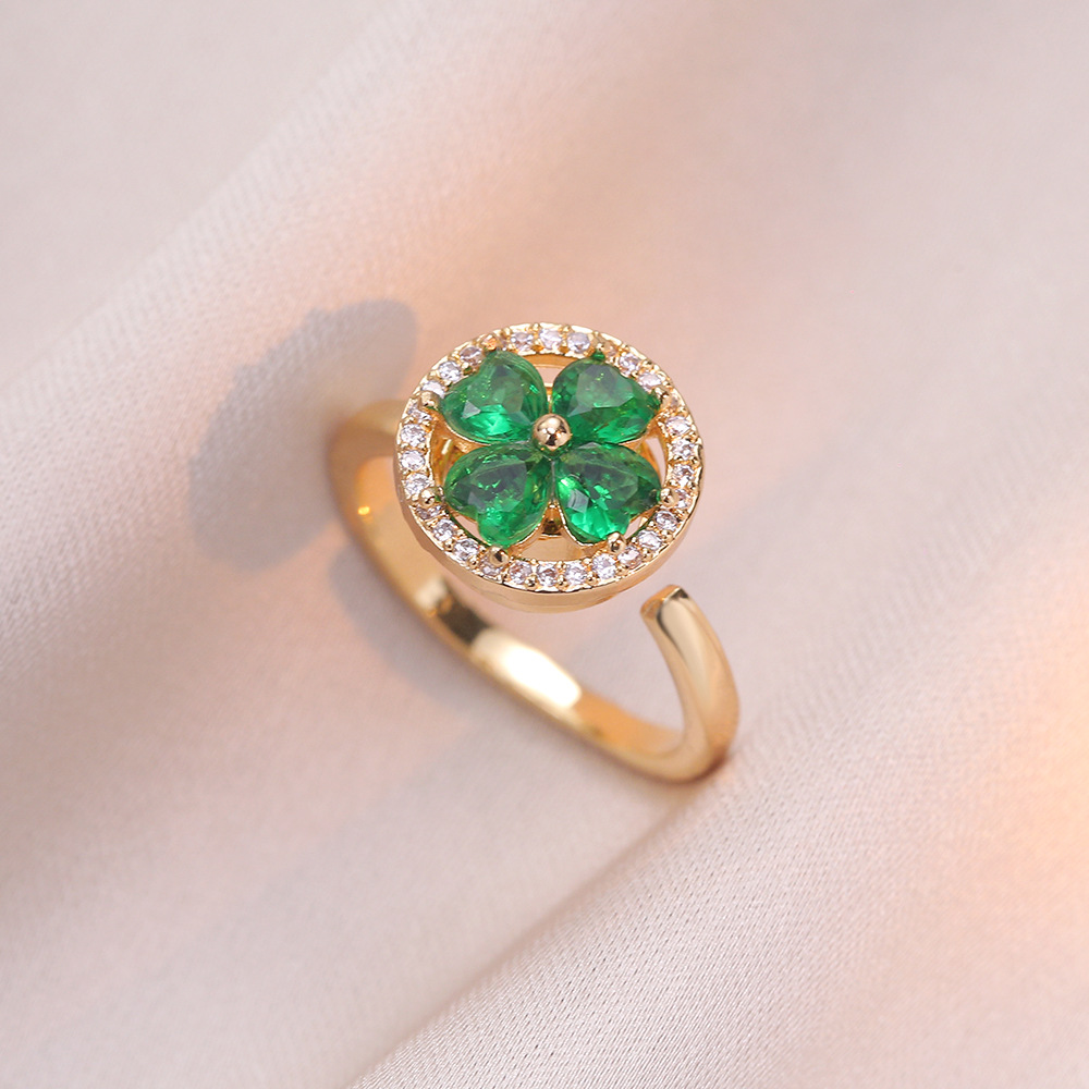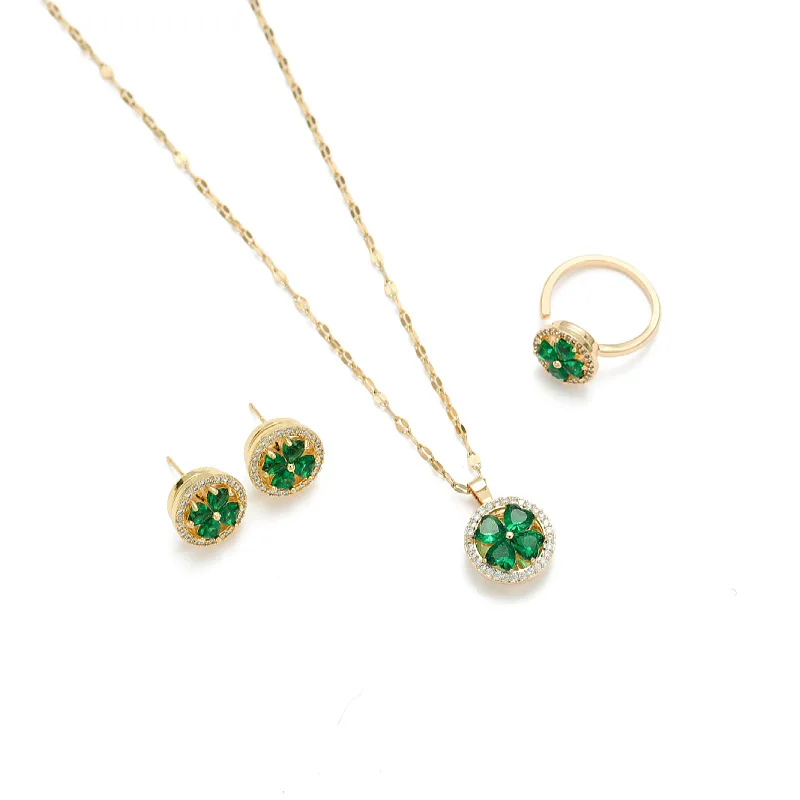 Classic Refined Chic Elegant 18K Gold Stainless Steel Four-leaf Zircon Pendant Necklace Spinner Ring Set