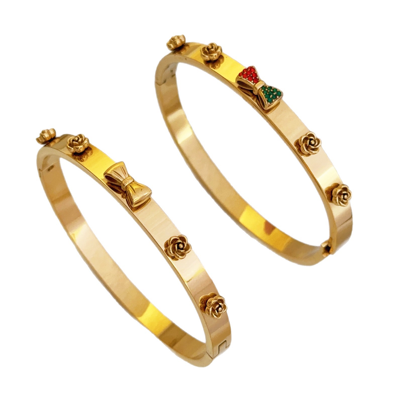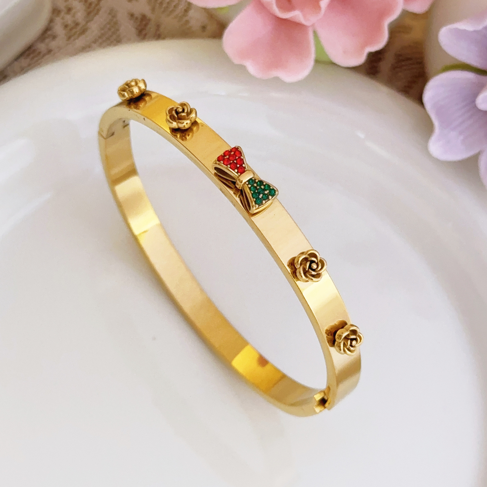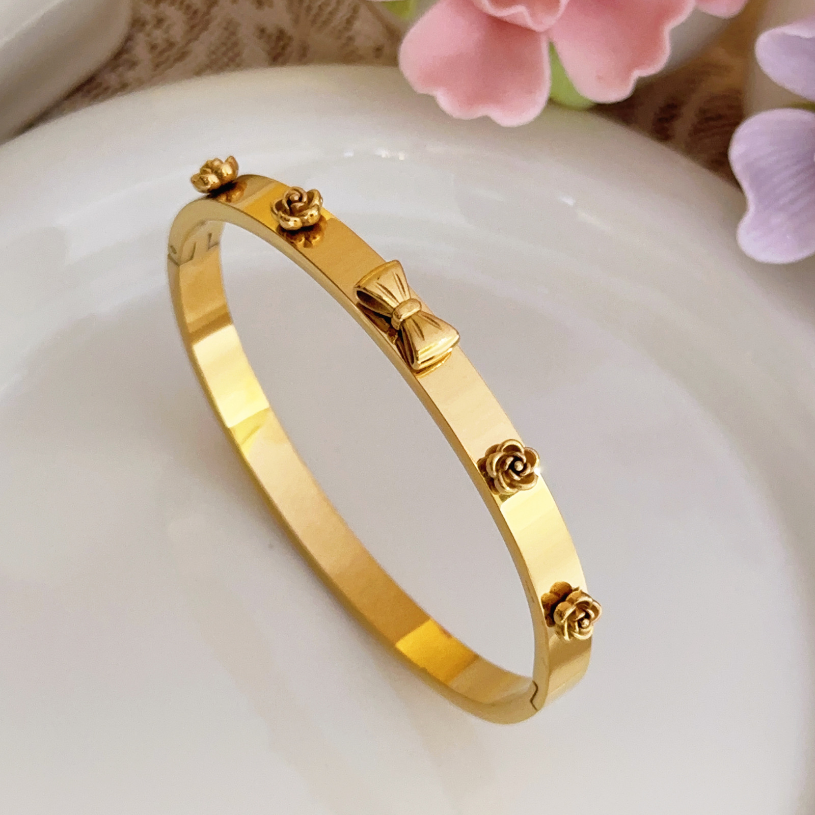 Be the first to review “Exaggerated Titanium Steel Bracelet with Bowknot, Niche Gold Flower Bracelet, 18k Gold Geometric Hip Hop Jewelry” Cancel reply