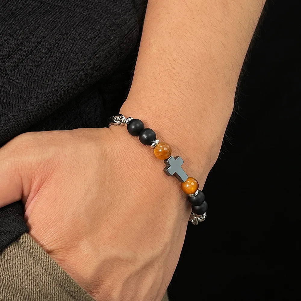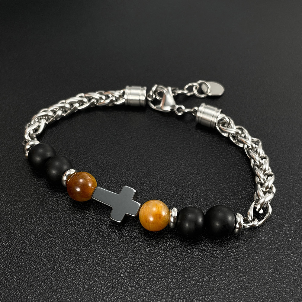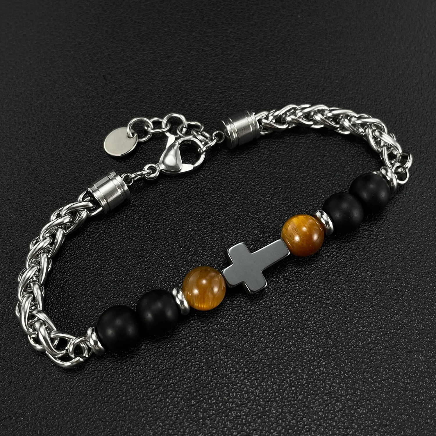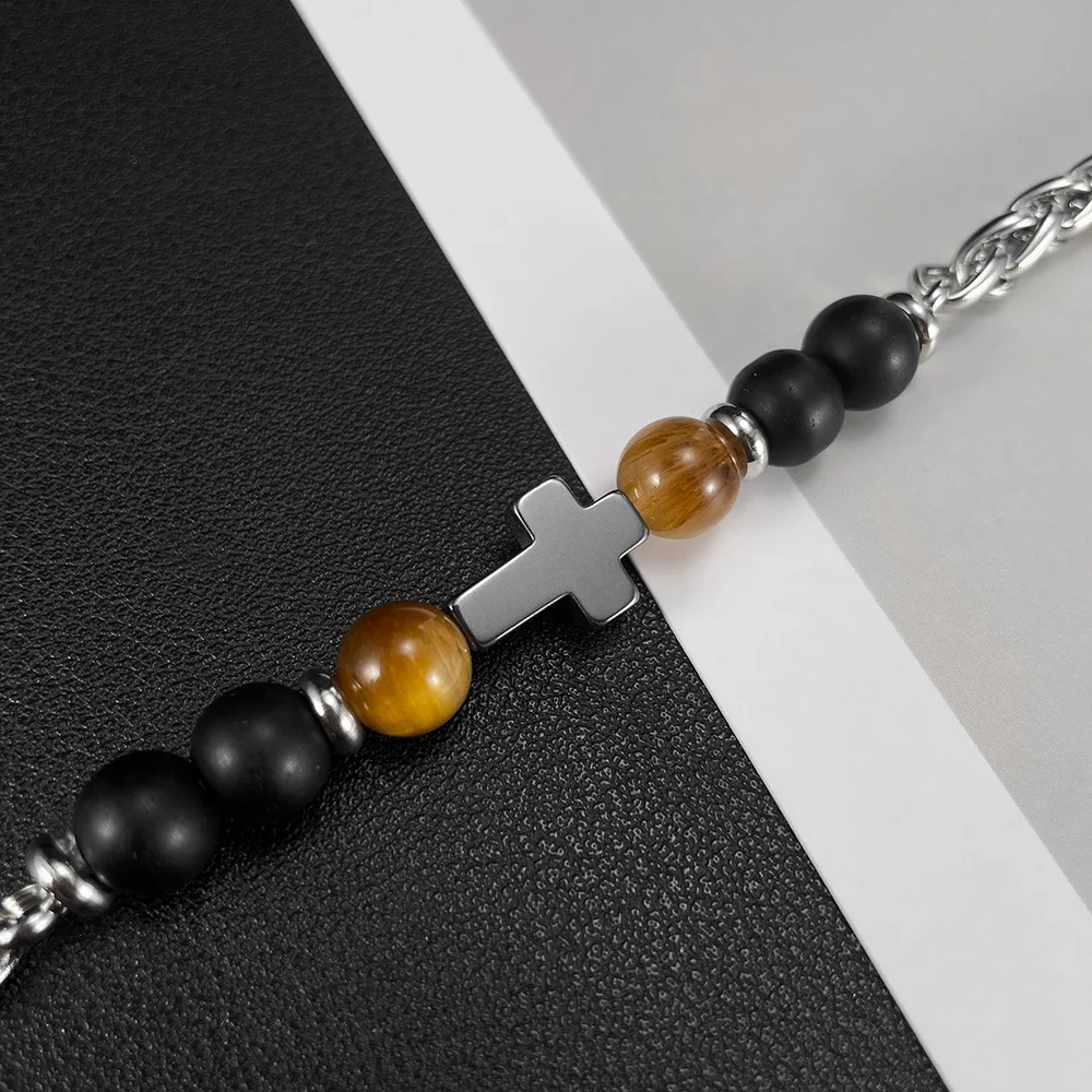 Hot Selling Personality Cross Tigereye Stitching Stainless Steel Chain Men’s Bracelet