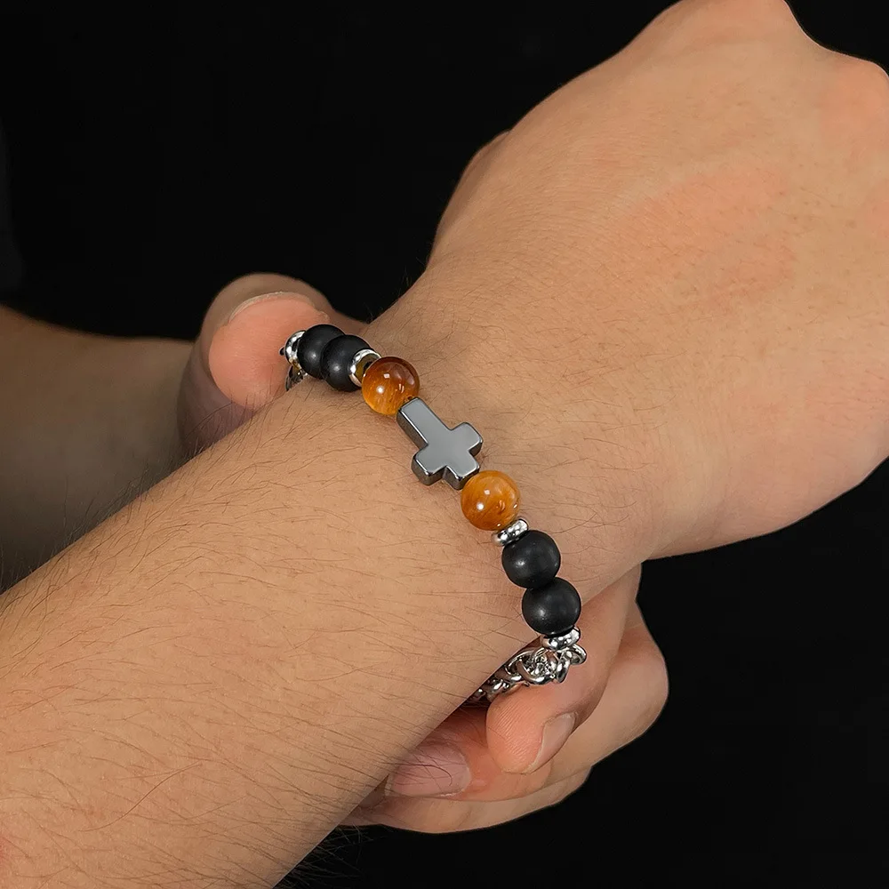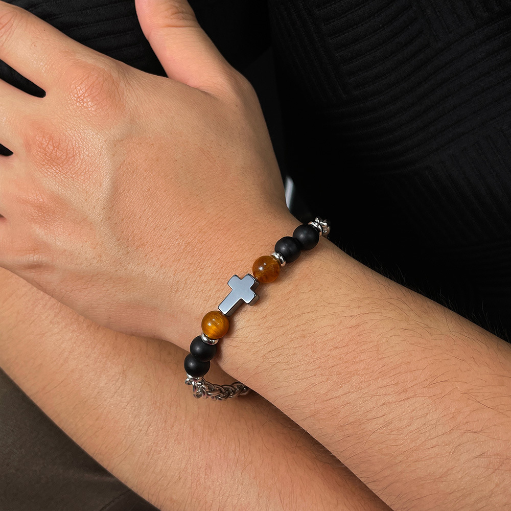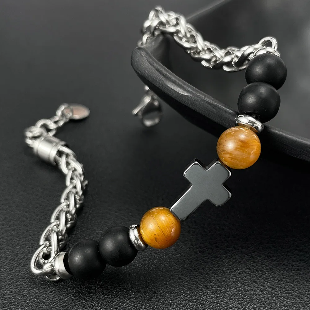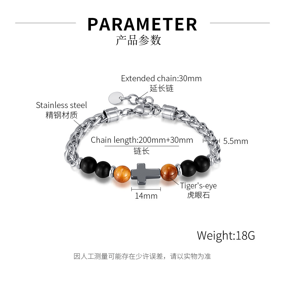 Hot Selling Personality Cross Tigereye Stitching Stainless Steel Chain Men’s Bracelet