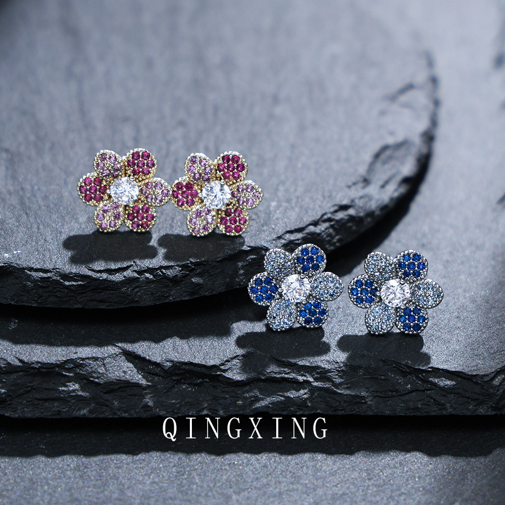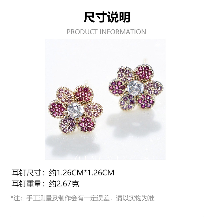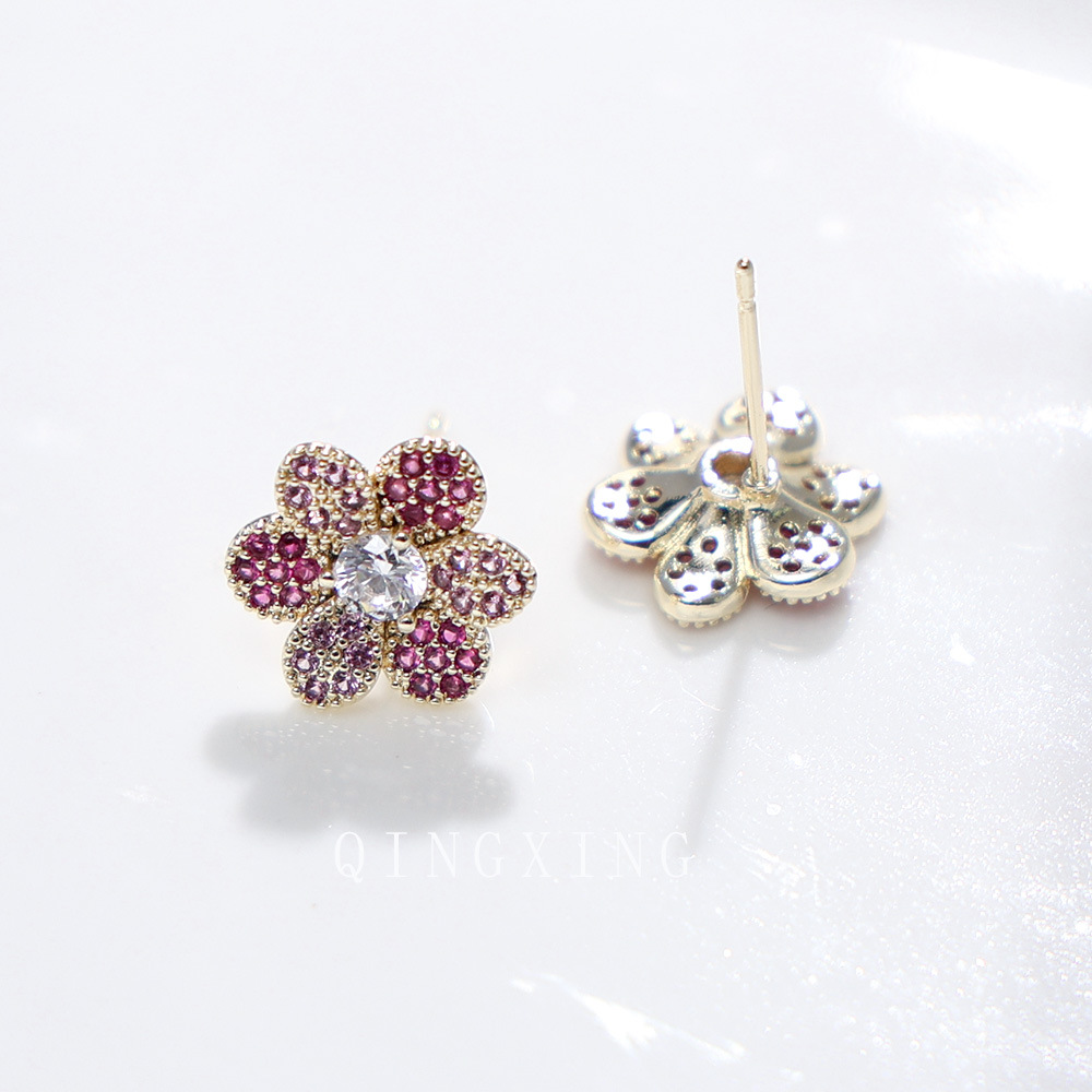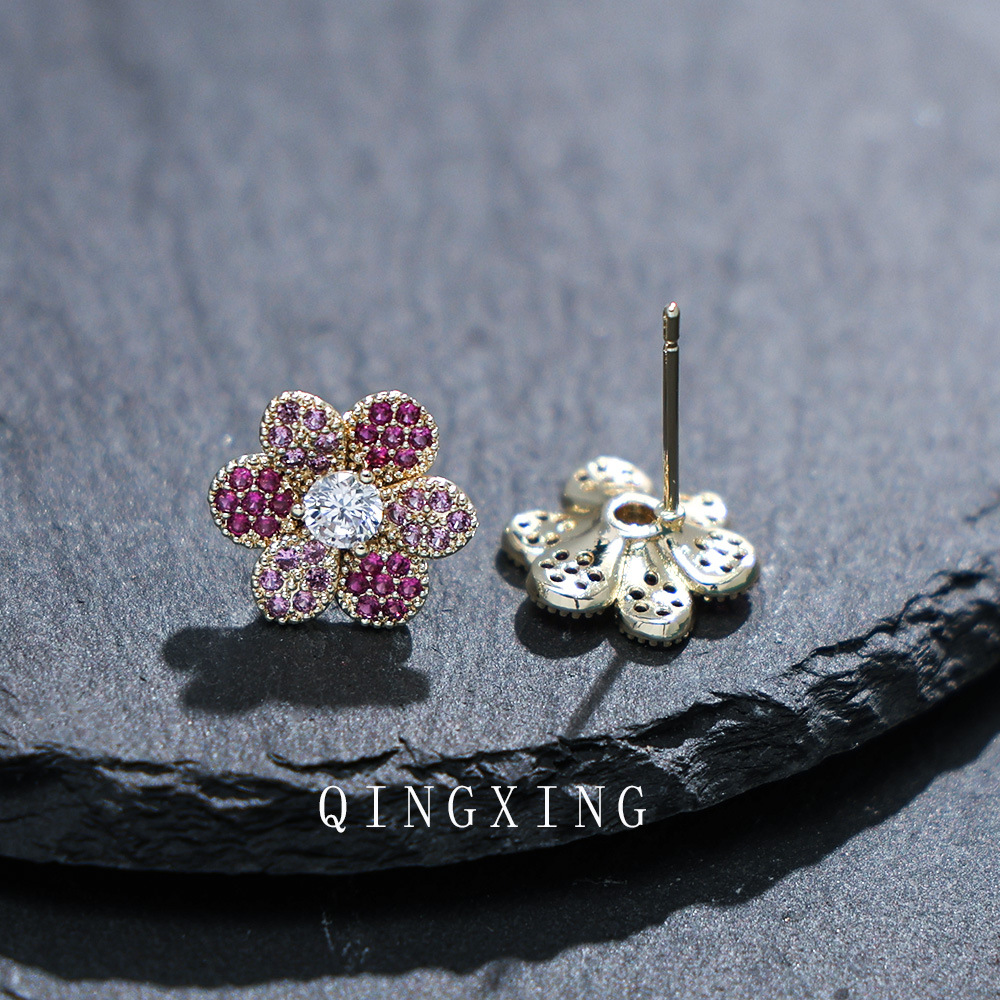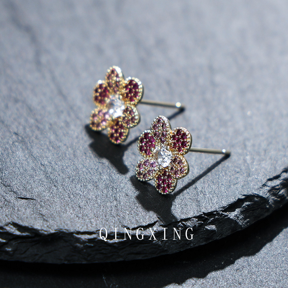 New Japanese and Korean fashion sweet flower earrings micro-set synthetic red sapphire gradient exquisite small flower earrings for girls