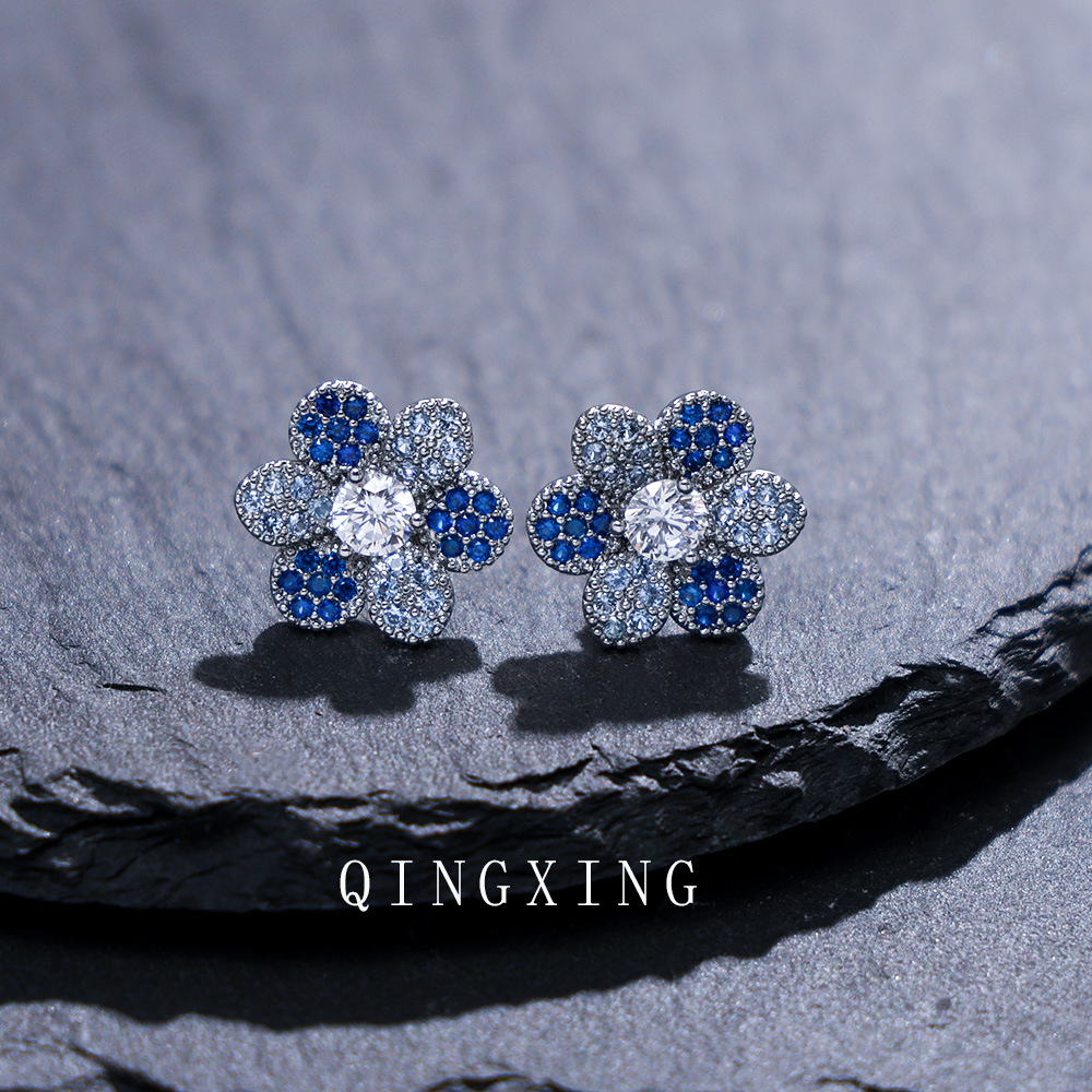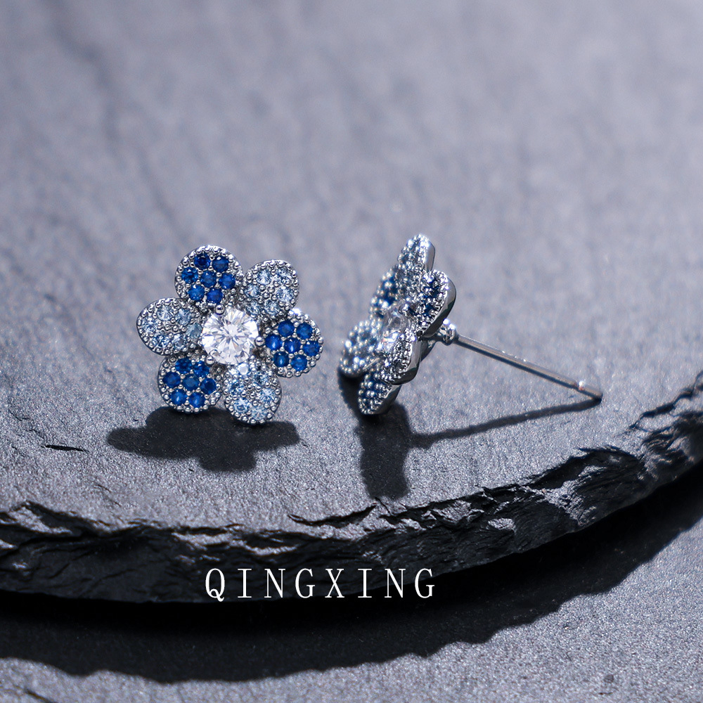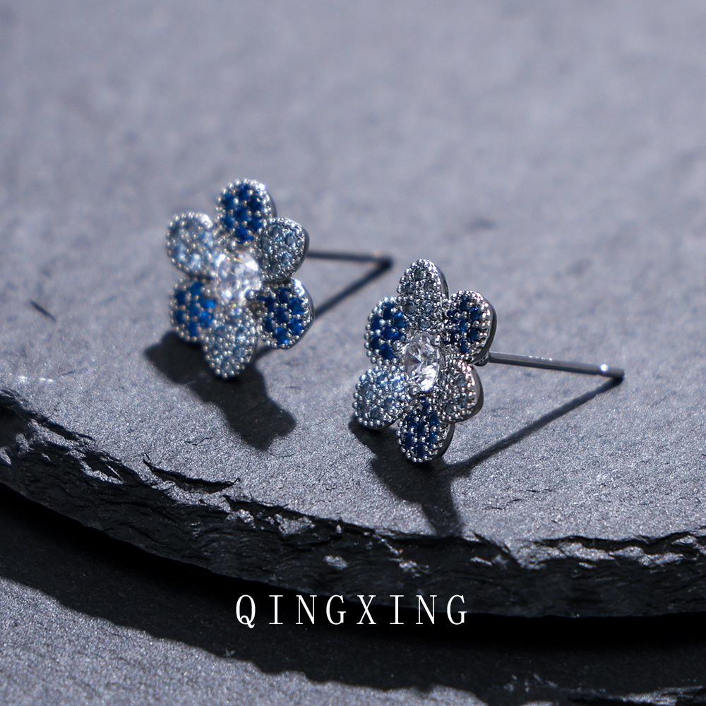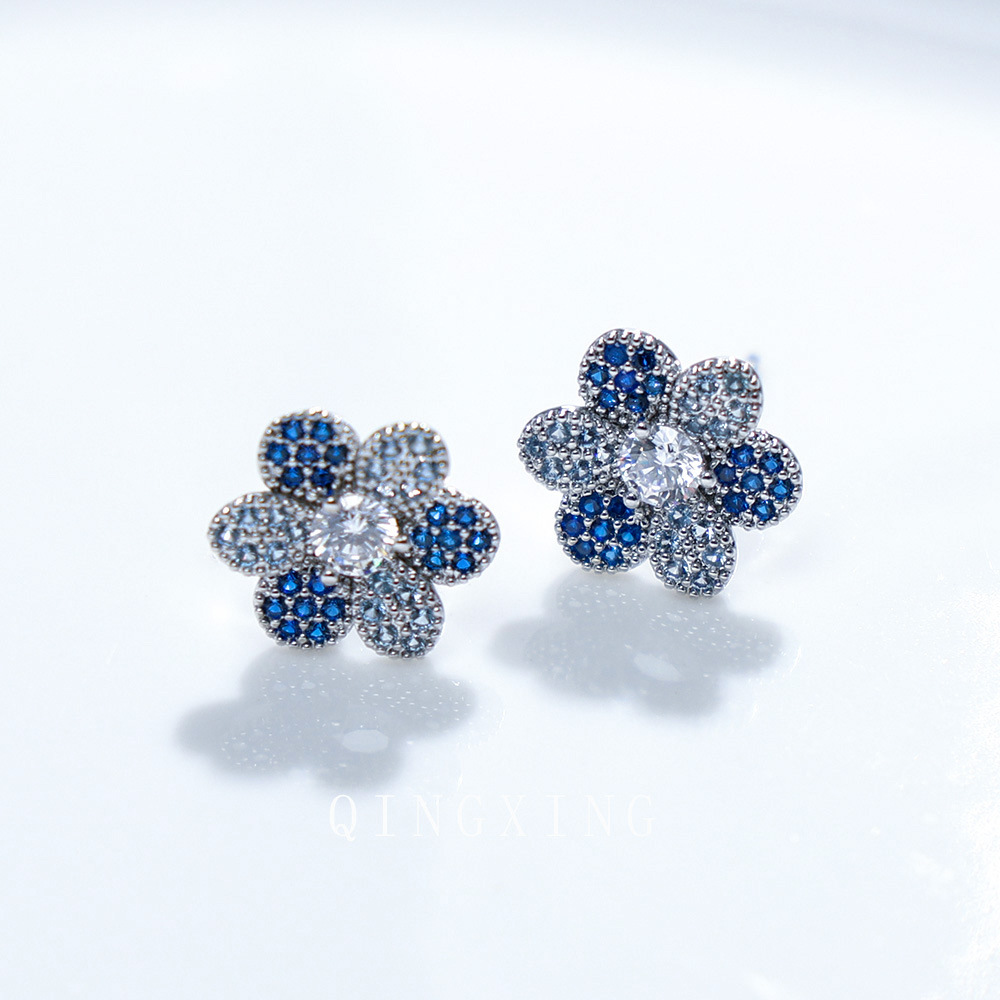 New Japanese and Korean fashion sweet flower earrings micro-set synthetic red sapphire gradient exquisite small flower earrings for girls
