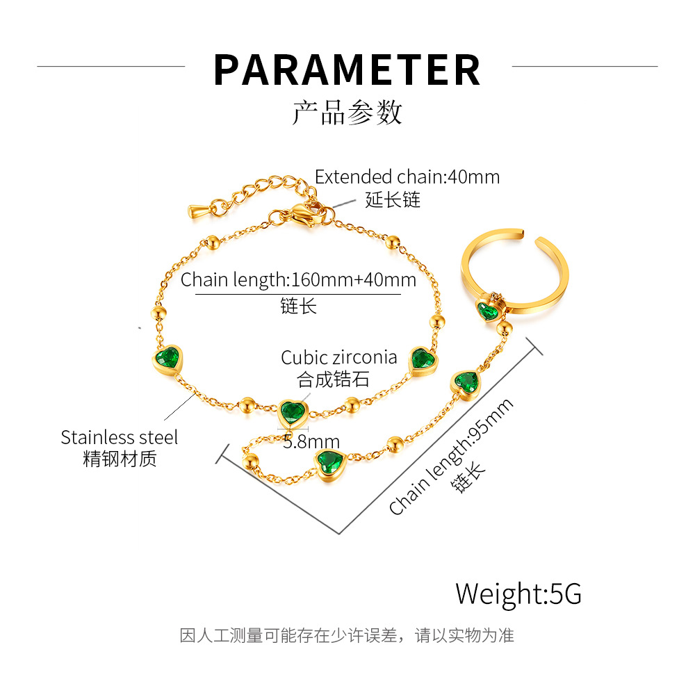 Niche Elegant Emerald Loving Heart Zircon Stainless Steel Ring Bracelet Integrated Ladies Finger Chain