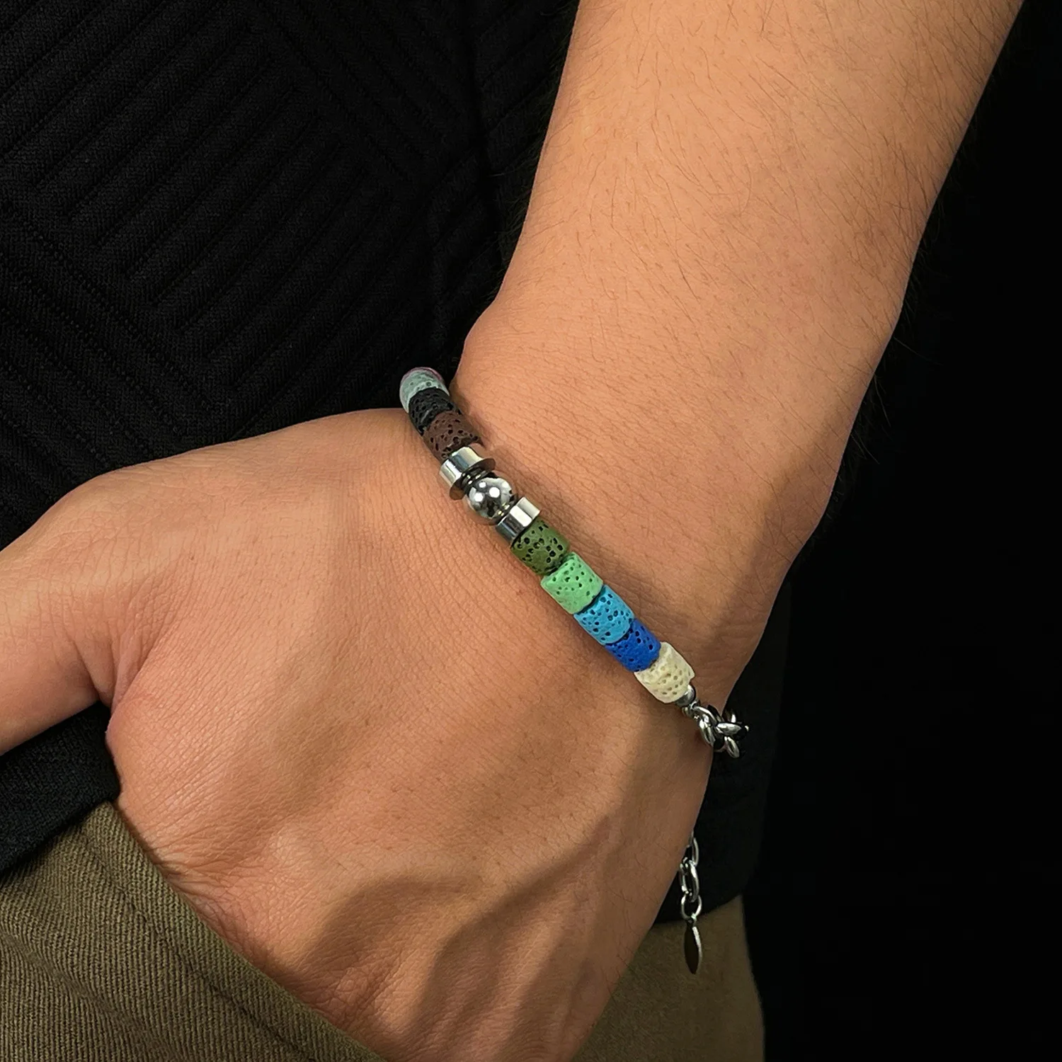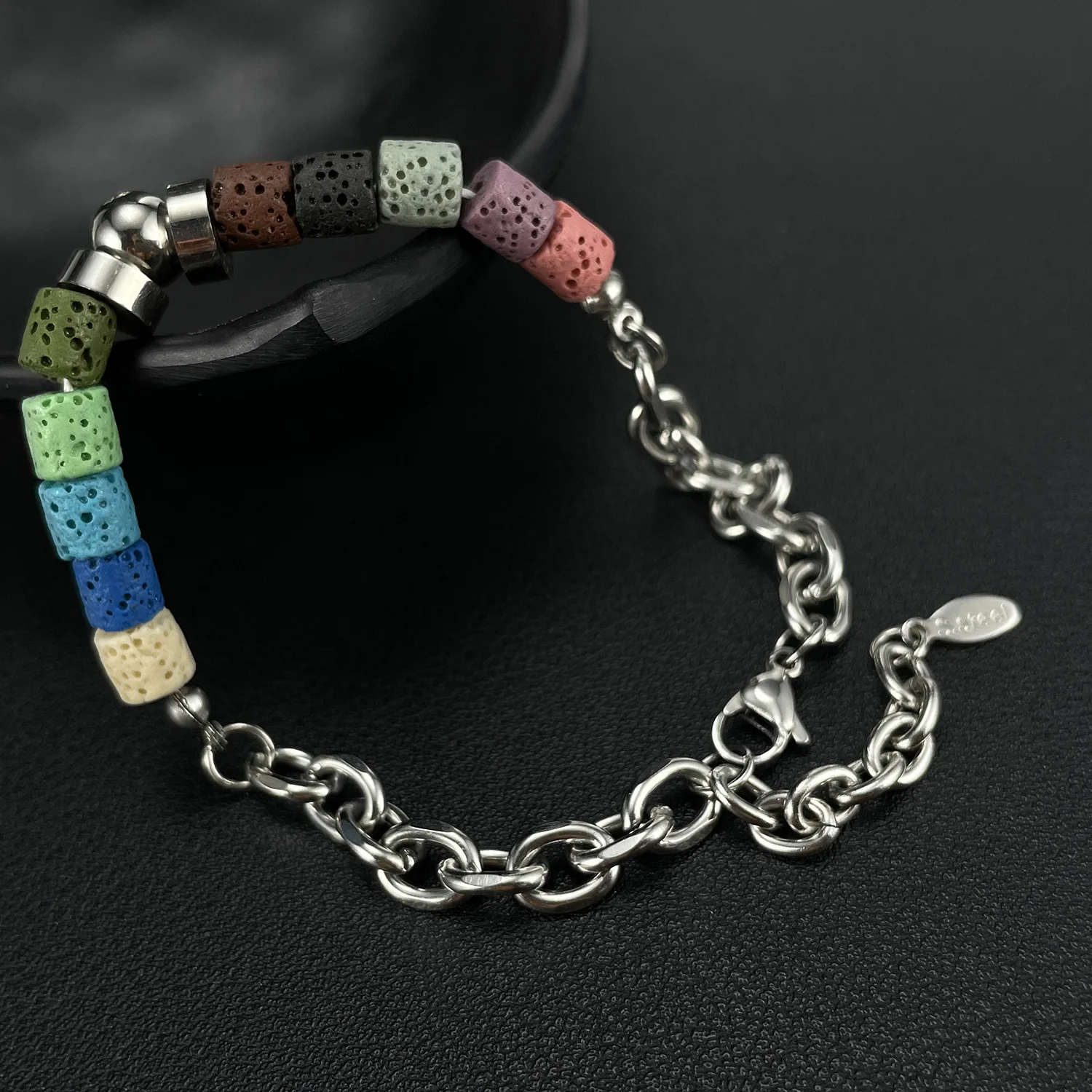 Personalized Creative Design Stainless Steel Chain Stitching Color Volcanic Stone Bracelet Men