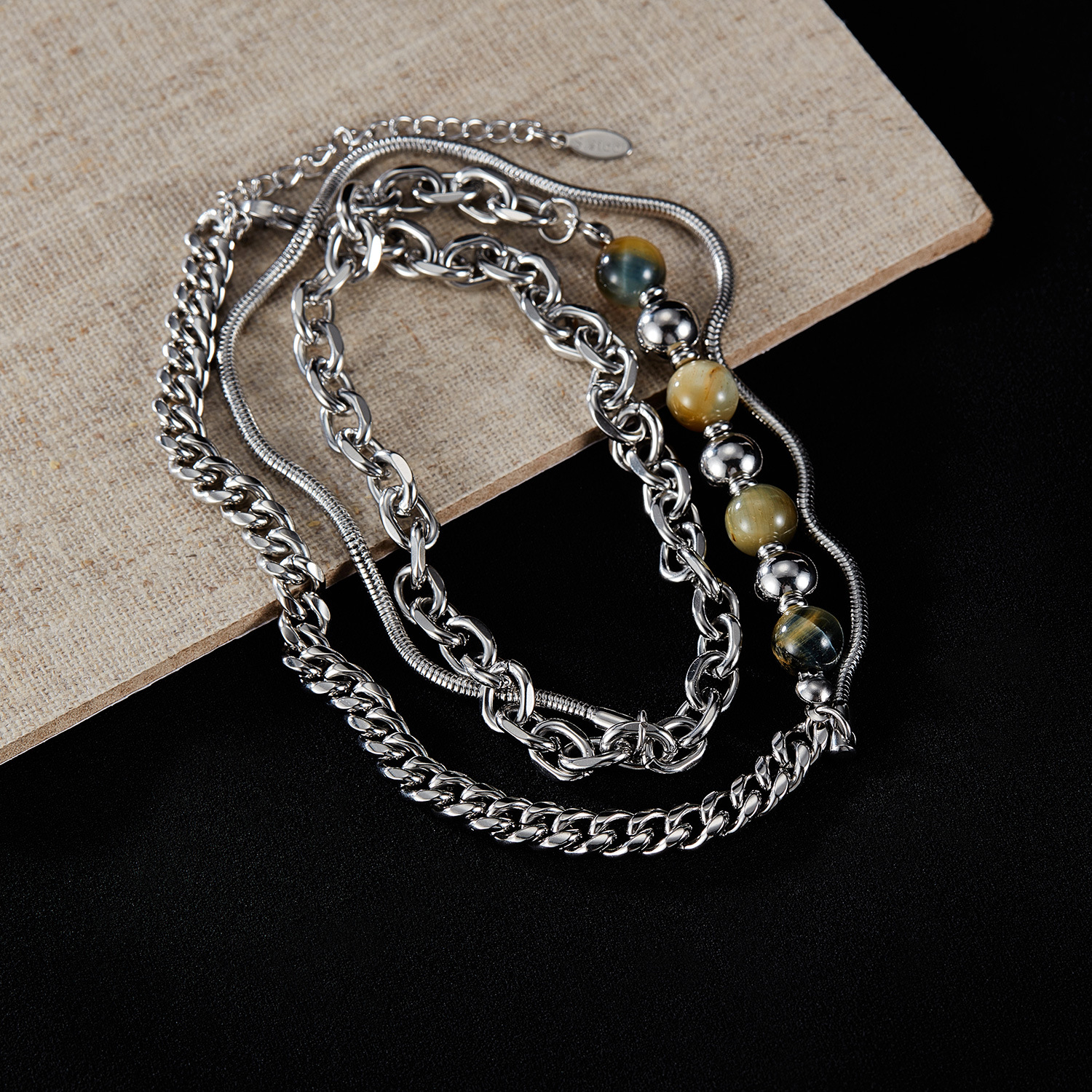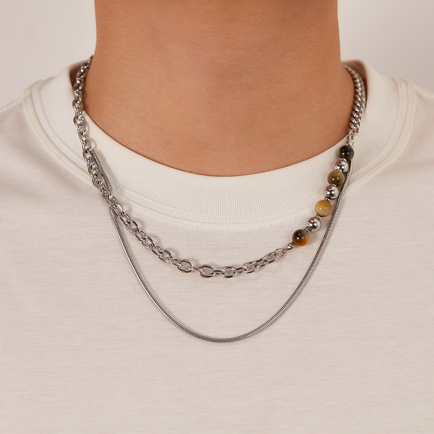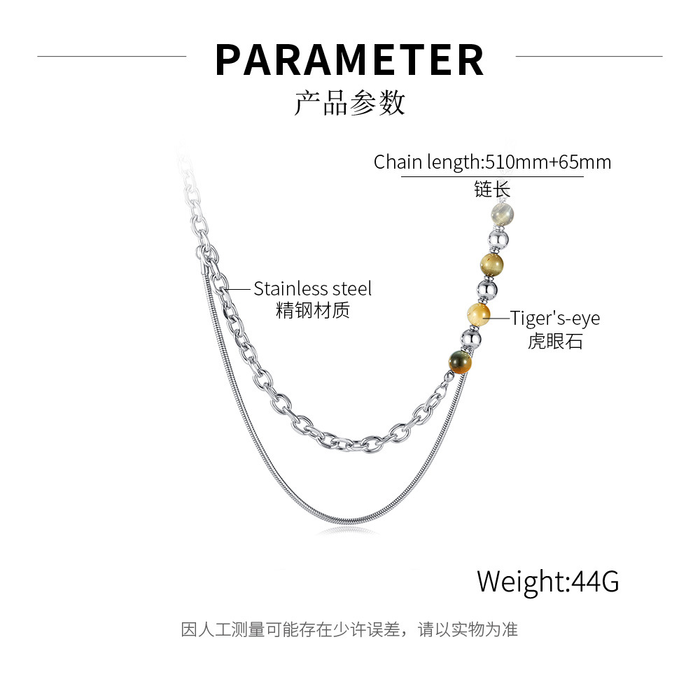 Personalized, Stylish and Simple Stainless Steel Double-Layer Chain Stitching Tigereye Necklace for Men