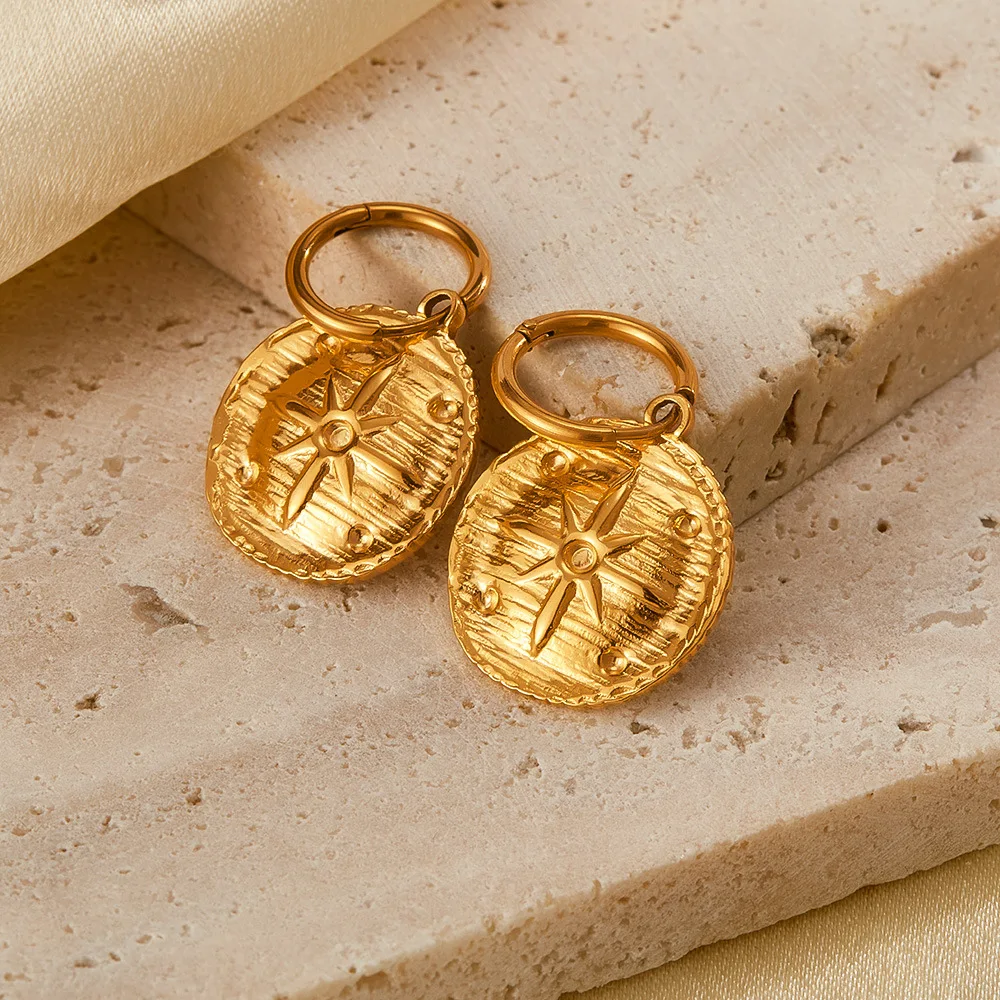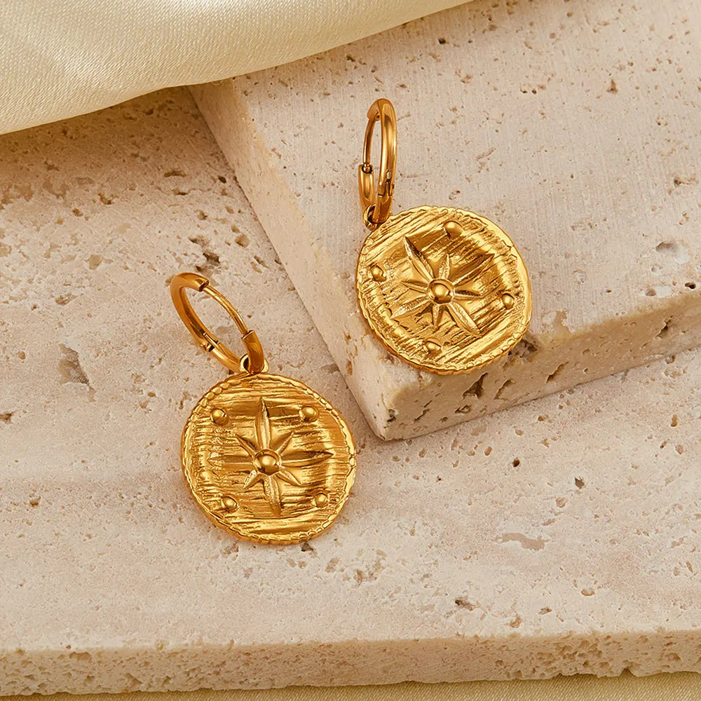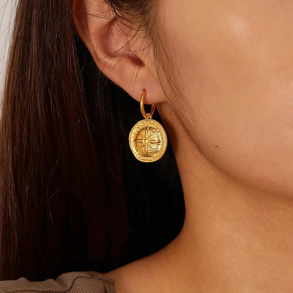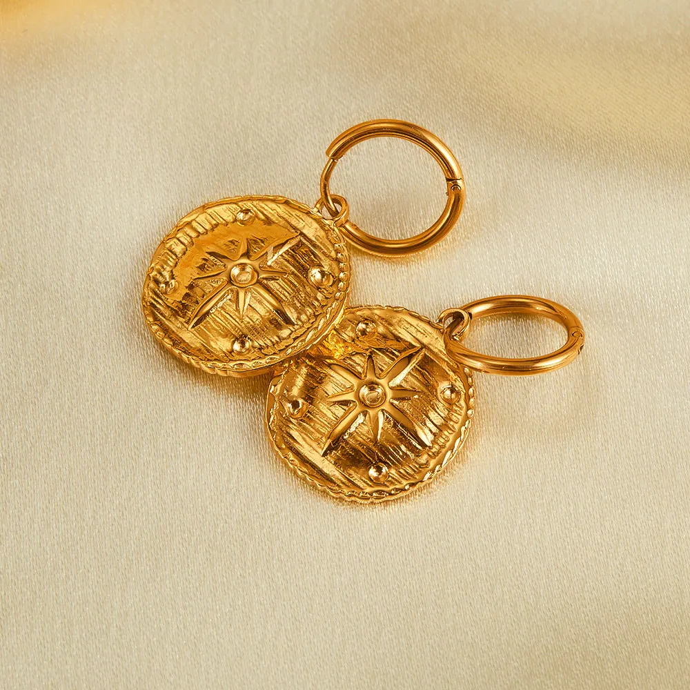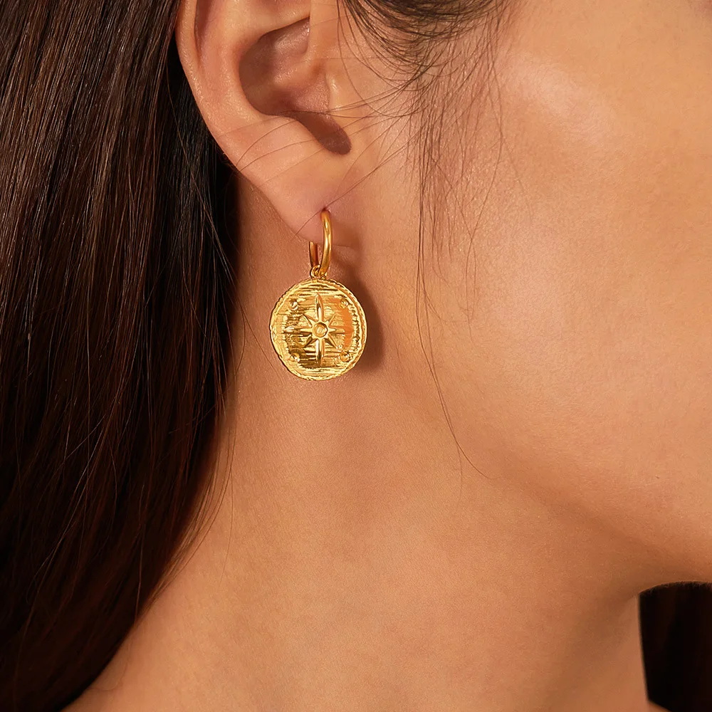Retro Stainless Steel round Board Sun Texture Earrings Simple Gold Plated Earrings