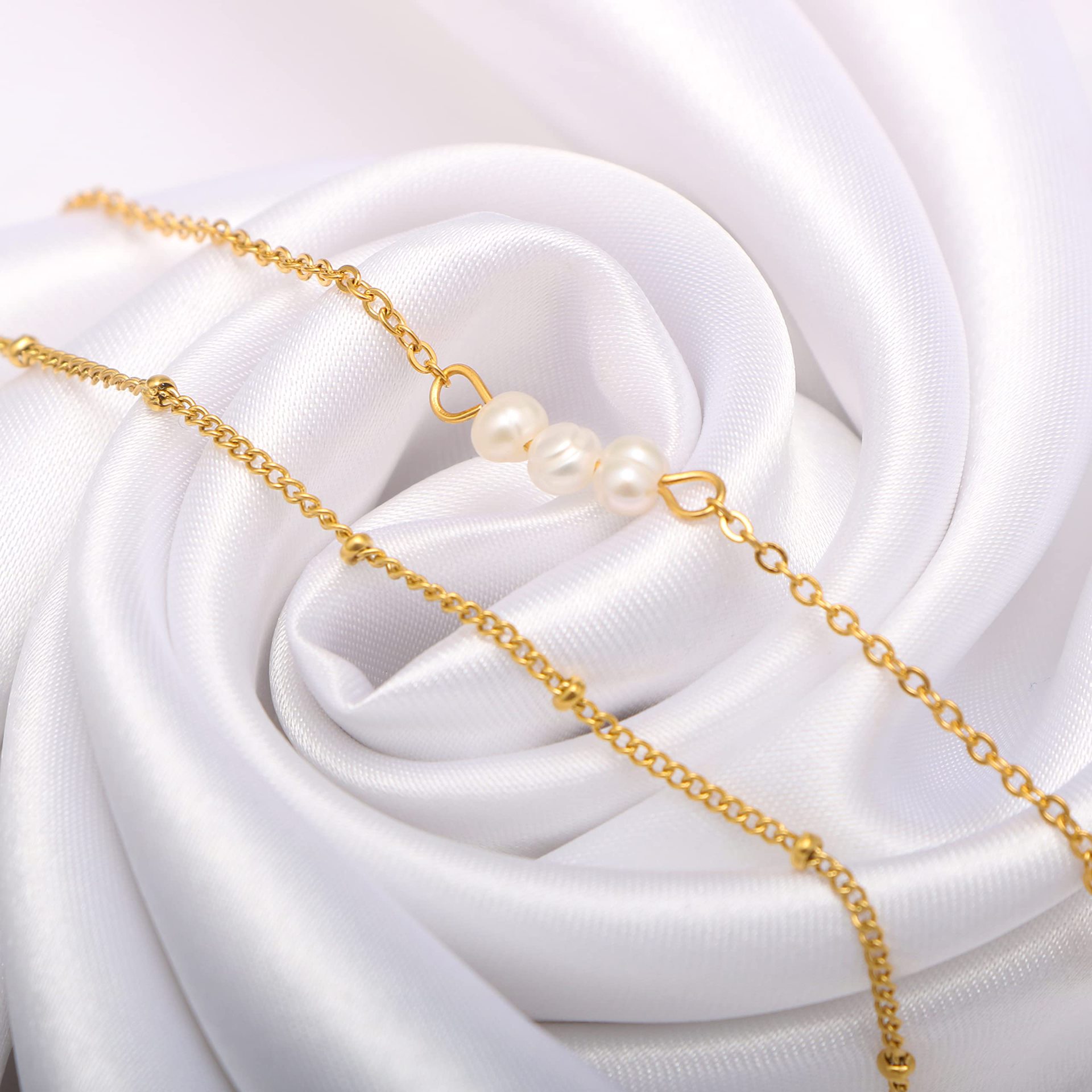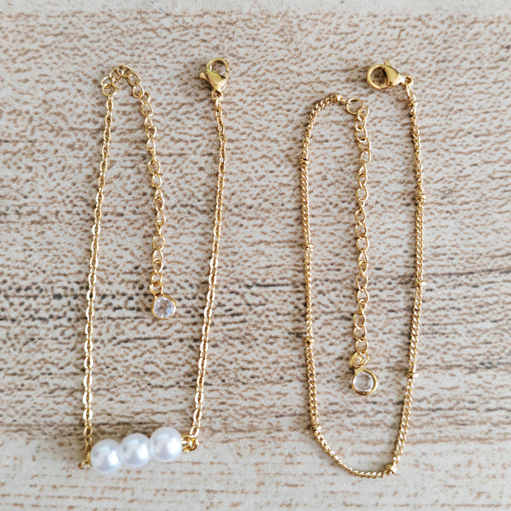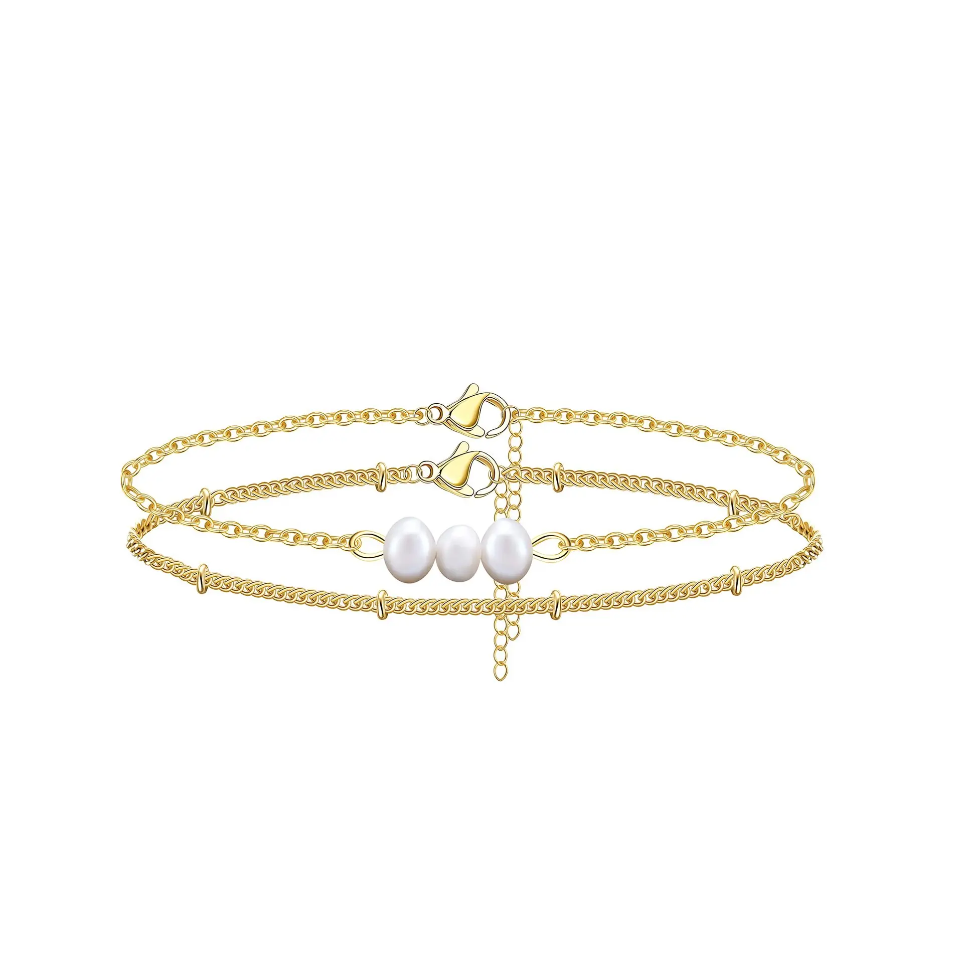 Stainless Steel Chain 18K Plated Double Layer 6mm Imitation Pearl Bracelet Women Ladies Gift