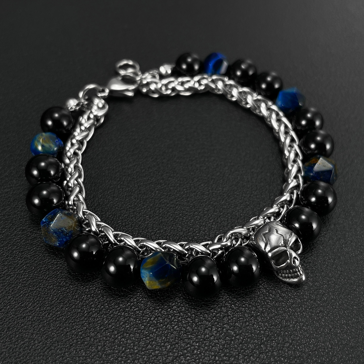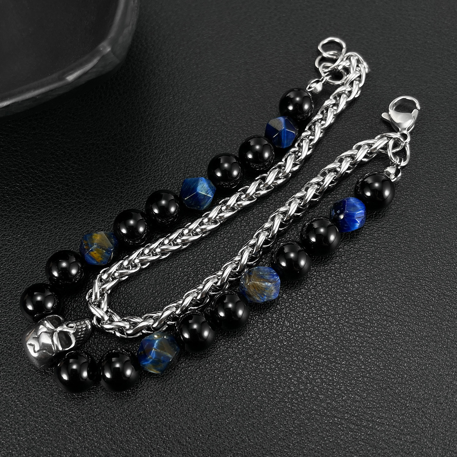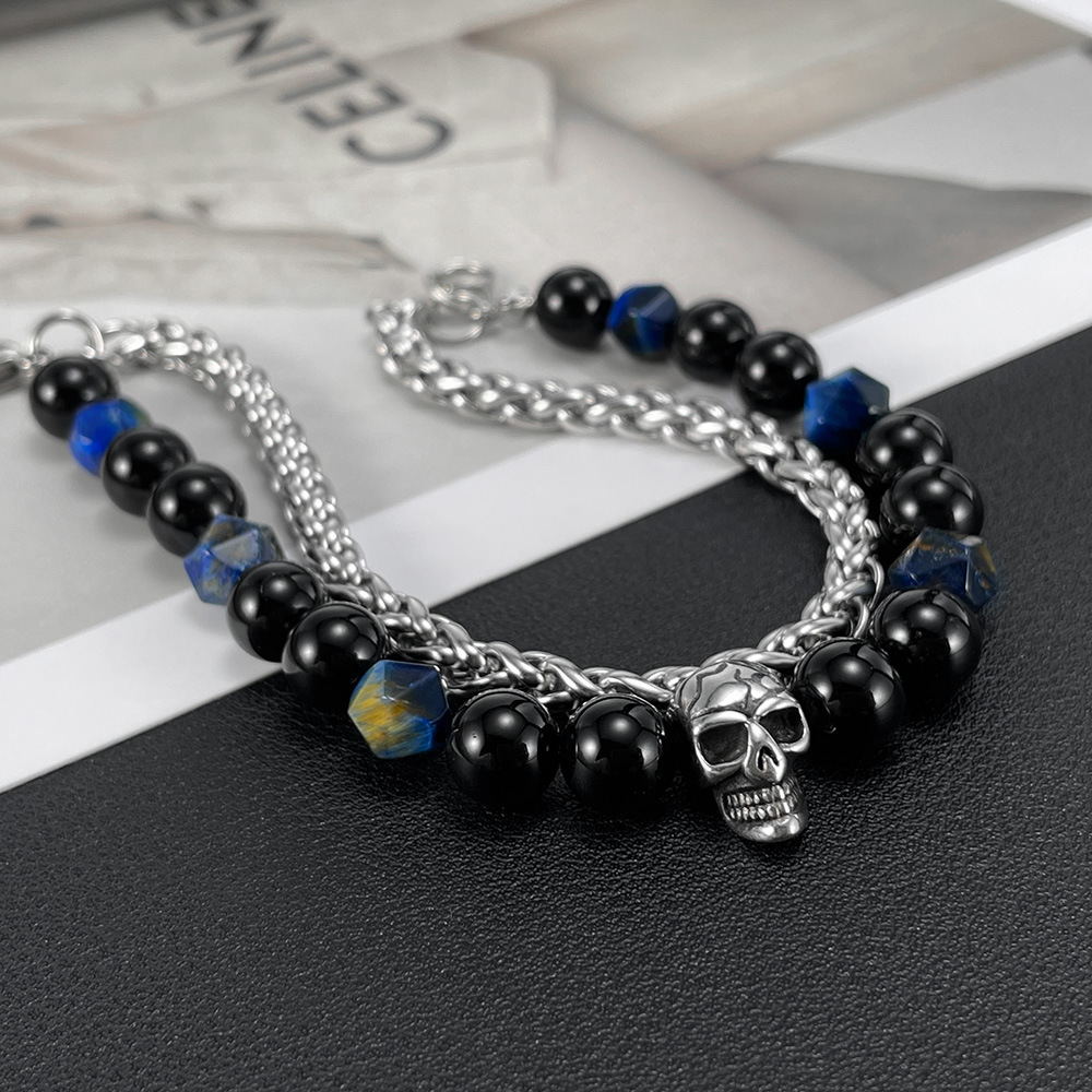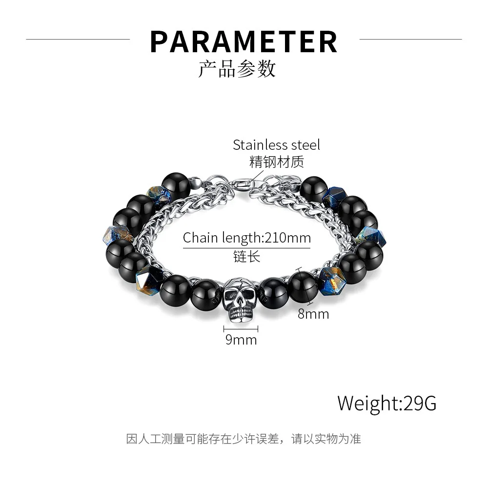 Stainless Steel Double Layer Twin Skull Black Glass Beads Bracelet Men